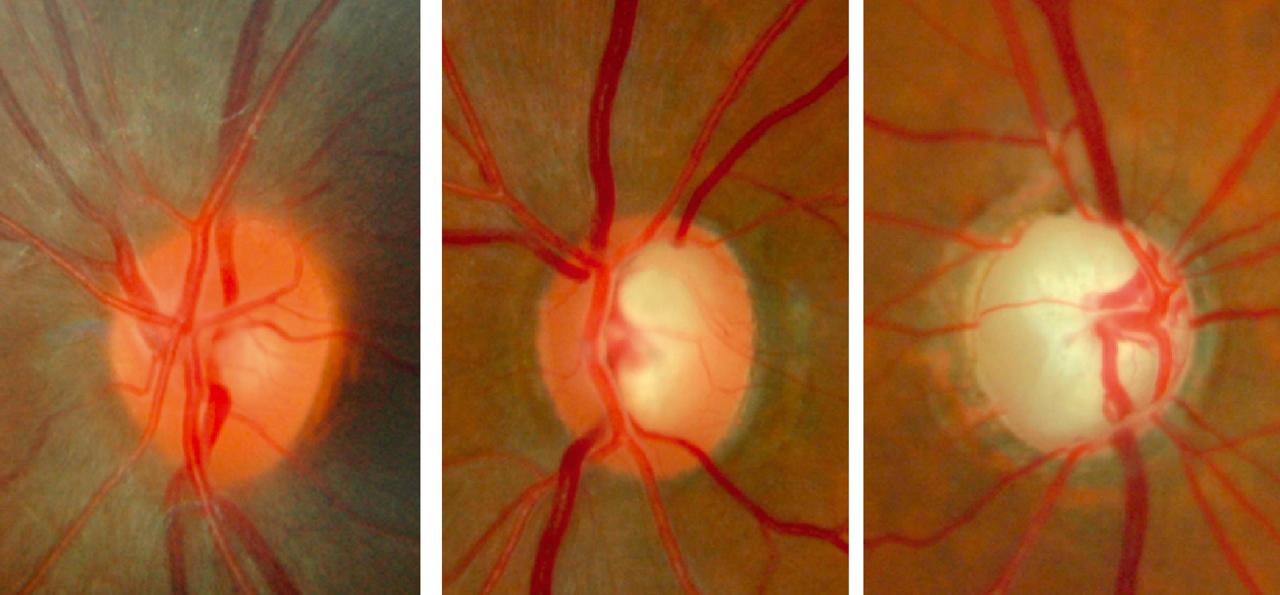 غالباً لا توجد أعراض في المراحل الأولى. بقع عمياء في الرؤية الجانبية أو المركزية. فقدان الرؤية الجانبية (الرؤية النفقية) في المراحل المتقدمة.